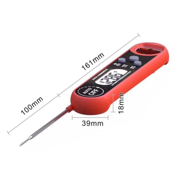 | Product size: 161*39*18mm Measuring range: -50°C to 300°C (-58°F to 572°F) Accuracy: +/-1°C( 2°F ) at -20 to 200°C, +/-2°C( 4°F ) at other range Resolution: 0.1°C(0.2°F) Material: ABS plastic housing & Food 304 stainless steel probe Power: 3V button battery (Included) Power saving: 10 minutes auto-off Foldable probe: φ3.5*100mm with φ1.7mm fine tip 3 seconds super fast response Inside magnet on the backside Bright white backlit Min/Max temperature record Data hold function Calibration function IP67 Waterproof structure Auto-rotation dispaly 240° probe rotation Built-in bottle opener | ||